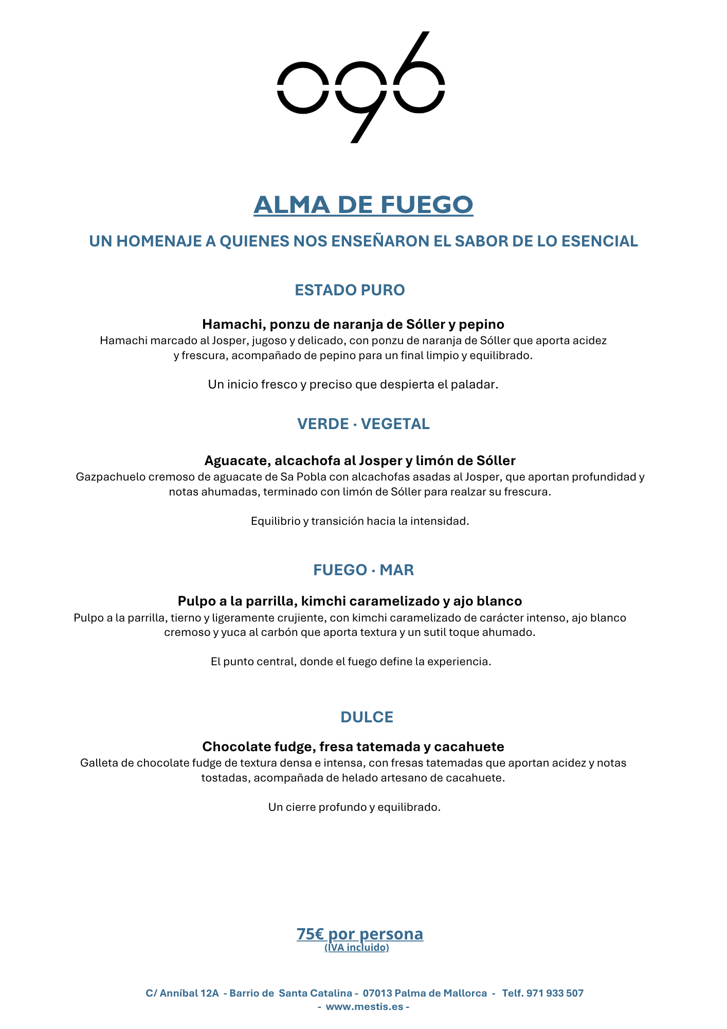 Este Día de la Madre, en O96 hemos diseñado una experiencia que nace del producto, el fuego y la emoción. Un recorrido gastronómico que combina frescura, técnica y carácter, donde cada plato busca equilibrar matices y despertar los sentidos. Desde notas vegetales y ligeras hasta elaboraciones más intensas marcadas por el Josper, el menú avanza con armonía hasta un final dulce y profundo. Una propuesta pensada para compartir, disfrutar sin prisa y celebrar alrededor de la mesa a quienes nos enseñaron el verdadero valor de lo esencial.